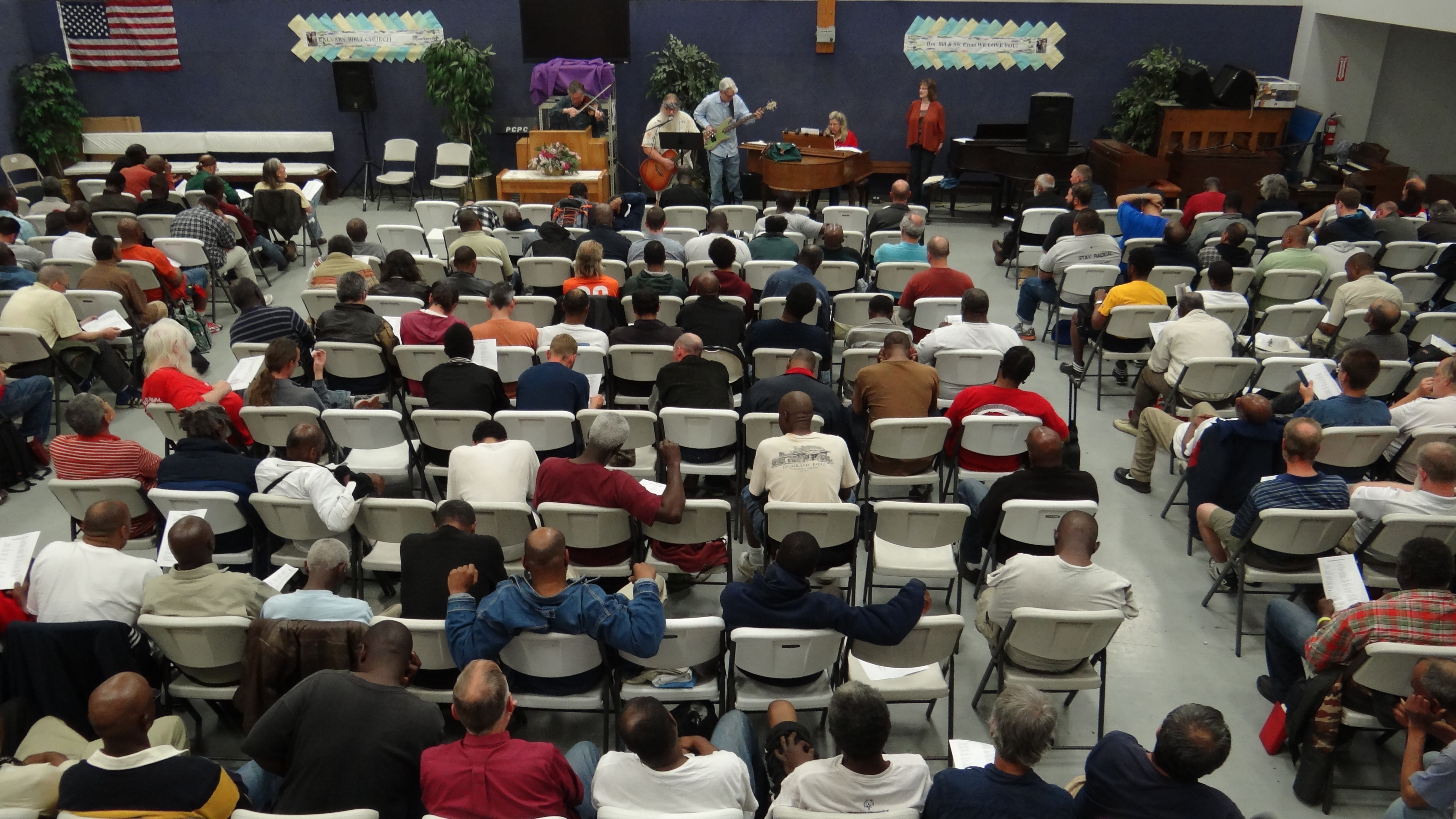 Beginning in 1963, Trinity Bible Church has ministered to the men of Union Gospel Mission. Every 4th Friday of the month, a group of us from church go down to the Men’s Shelter at Calvert Place and host a chapel service featuring music, speakers, a message from God’s Word, and prayer before the men gather together to share in a meal. The Shelter hosts a nightly chapel service along with each evening meal. It has been a sheer joy for our band of brothers and sisters in Christ to spend time with these precious souls trying to find their way and get their lives back on the right track.