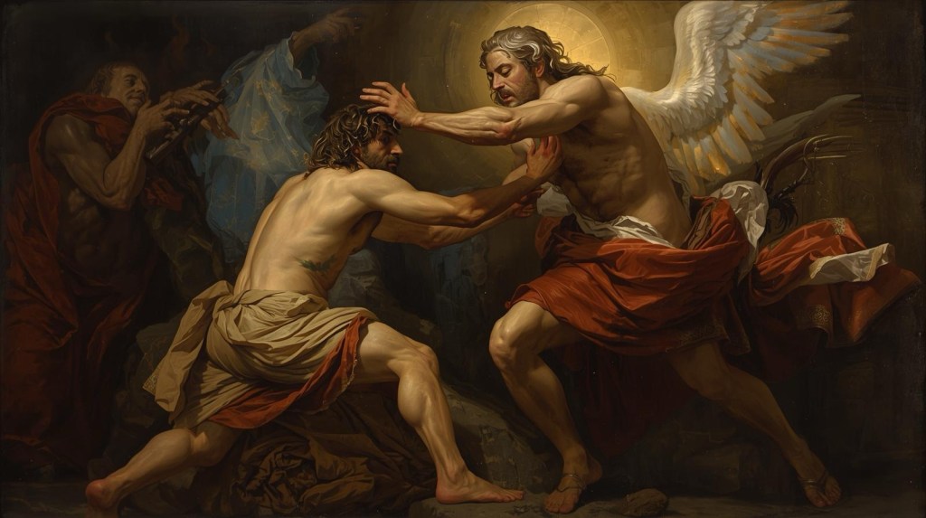 That night, alone, Jacob wrestles with a mysterious man until daybreak.